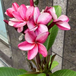 YS散🍀 ヘアーサロン✂️の入り口に インドソケイ(インド素馨)💗 別名・プルメリア・ラブラ 花言葉「希望の誕生,再生,新しい命」 キョウチクトウ科 プルメリア属,インドソケイ属