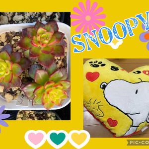 こんばんは⭐️ ⬅️マジックジャムゴールドが紅葉🍁してきました😊 黄色と赤がたくさんの多肉の中でも目立ちます💖 ➡️🏷️毎月2日はスヌーピーの日 娘が自分の部屋を片付け中❗️ 「スヌーピーのクッション、もういらない」っていうので、もらって洗って、私が使うことに😊 結構大きくて、ふかふか💕