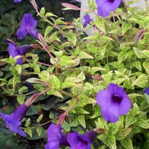 トレニアをもう一種。 ブルーインパルス。 先ほどのカタリーナ ブルーリバーと 花の色や形はほぼ同じですが 葉が明るい斑入りでとっても綺麗です。 花の数はあまり多くありませんが 葉っぱが豊かに繁って鮮やか。 旺盛に枝垂れさせてみたい美形さんです。