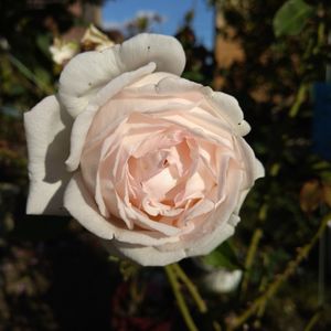 中心はクリームピンク、周りをソフトベージュの花弁が覆うカップ咲き、ダマスク系強香 芳しい薫りとその花姿の美しさから名付けられた