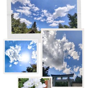 お久しぶりに、土曜はお空の発表会🏷 先日、参拝にあがった小國神社の境内で見上げた空🤍🤍✨❇️☁☁☁ と、我が家の花手毬ホワイト🤍🤍🌱