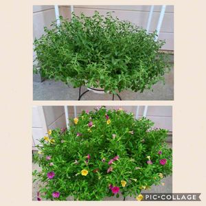 すぐ楽ミリオンベル チェリー🍒&バナナ🍌 すぐ楽サフィニア ぷらむ&さくら どちらも、お気に入りの色👍 前回の満開は、一緒に📸できず。 今回、同時に咲いて、揃ってモリモリ🍄、記念に📸💦