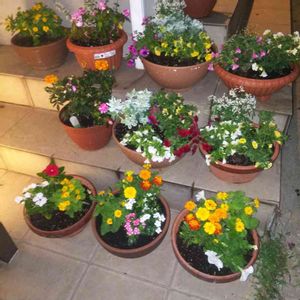 玄関のミリオンベル𖧷 今はバナナ🍌と逆転して チェリーがたくさん🍒 バランス...😂 後ろのロベリアをジニアに植え替えました 30円苗だったのでコメリでお買い上げ✨これから頑張ってもらいます😆🙌