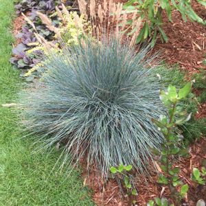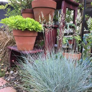 フェスツカのインテスブルー。この品種は葉が直立し、ブルーグレーでドライな感じがよく、つい買ってしまった。 別の品種を今年枯らしたけど、葉は細く垂れ、枯れ易く、別物。 ただし値段も3倍。。。
