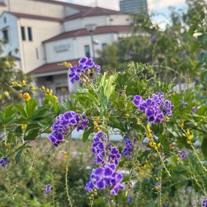 🟣デュランタ宝塚🟣 クマツヅラ科 園芸品種 紫の花弁に白い線がある 花後、有毒のオレンジの実を付ける 低木とあったがこの木は見上げるほど大きな木だ ジュランダと思っていましたがデュランタらしいので訂正します