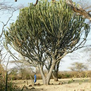 巨大なユーフォルビア。 木の上では小鳥が新葉を食べ散らかし、木の下ではハイラックスが新葉の拾い食い。 なんとも平和な風景です。