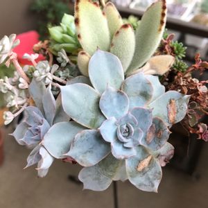 この間購入した多肉さん。右の子、初めはバラっぽいきれいな形だったのに…徒長??形がだいぶ変わってきちゃいました😭😭😭 なんででしょう…そしてこれからどうすれば…😭😭😭 レースカーテン越しに日光あてて、風通しの良い場所に置いていました😭😭💦2週間前くらいに購入し、今日初めてお水をあげました。 名前もわからない子ですが、バラっぽいロゼットの形の多肉植物。調べてたらエケベリア?って子と似てるのかなー??って感じです。 大きさはすごく小さくて5センチくらい。この2つで200円で買いました。 きれいな形に戻すには、これからどうしたら良いのか教えてください😭🙏🙏🙏