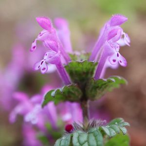 【ホトケノザ(仏の座、三階草)】 日本原産、シソ科の越年草 本州から沖縄にかけて分布。道端や畑などに生える。 上部の葉の脇に紅紫色をした唇形の花を数個ずつ輪生する。 花冠には細長い筒があり、下の唇は3つに裂ける。 名の由来は、花の下にある葉が茎を包み込むようになっているのを仏の蓮華座に見立てたものである。 高さ:10~30センチ、開花時期:2月~6月 花色:ピンク~紫色 山口市維新百年記念公園にて