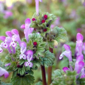 【ホトケノザ(仏の座・三階草)】 シソ科の越年草。 本州から沖縄にかけて分布。道端や畑などに生える。 上部の葉の脇に紅紫色をした唇形の花を数個ずつ輪生する。 花冠には細長い筒があり、下の唇は3つに裂ける。 名の由来は、花の下にある葉が茎を包み込むようになっているのを仏の蓮華座に見立てたものである。 高さ:10~30センチ、開花時期:3月~6月 花色:赤、紫 山口市維新百年記念公園にて