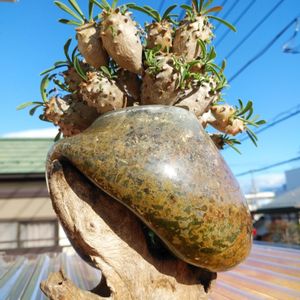 おはようございます☀いいお天気です😆 職場の上司から昨日頂いた峨眉山🌵😆 峨眉山🌵よりもこの鉢が欲しくて🤣🤣🤣 流木の土台とガラスの鉢は別で離すことが出来ちゃうんですよ😲ガラスの鉢には底穴も空いてます😉 「もう2年育てて飽きたから💦いる?」って聞かれて🙌もちろん欲しいです✨と…梱包材に包んで大事に持ってきて頂きました✨ このお尻のようなフォルム😍うふふ ちょっとエッチでしょ🤣いろいろ想像下さい(笑) 多肉棚の最上階で記念撮影しました😆📷✨ 今日からは鉢共々うちの子だよ~(๑´ლ`๑)フ°フ°♡