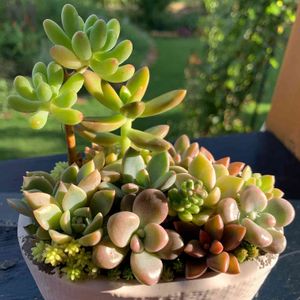 木立の恋ごころと間延びした黄麗さん 可愛くしたくて、葉挿し苗を合わせて寄せました。 間延びしてもそれはそれで楽しめるのも多肉のいいところ☝️