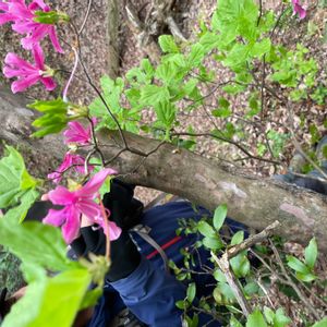 コバノミツバツツジ ワンちゃん連れの方も、子供連れの方も万人がヒョイヒョイ登っておられるので、こちらはほんまに散歩だけのつもりが、ついつい片道一時間の低山ハイキングをしてしまった ( ´∀`) 特に目立った植物には出会わなかったが、アカマツ林の中でコバノミツバツツジのピンクが目立つ🎵 ツツジの蕾は普通、毛のはえたネバネバした苞の中に2から4つ入っていて、それがグッと伸びてくると茶色い苞は裂けて下の方に残るか剥がれ落ちるように思う🟤 そんな中、コバノミツバツツジは正しく(?)最後まで苞から出てくる蕾は1つで、こんな風に苞の欠片が帽子のように残っている姿がよくみられる 19日はピンクの日🏷️
