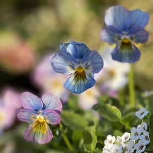 パステルカラーの ファンシーなビオラ 物産館出身です 以前、「ほほえむビオラ」として 投稿しました⋆⸜♡⸝⋆ 同じく寒さに強い スイートアリッサムと⋆⸜♡⸝⋆