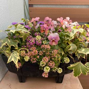 春の寄植え沢山作りました💕 まとめて写真を撮ったので順番に投稿します❣️ 1️⃣ セピア色のパンジーとミックスアリッサム。スカビオサが復活してきてます。斑入りヘデラの明るいグリーン。 作った時はパンジーがピンク系だけでなくブルー系もありましたが、色合いがピンク系だけに変化。スカビオサのパープルが目立ってきたらまた、雰囲気が変わるかも😊