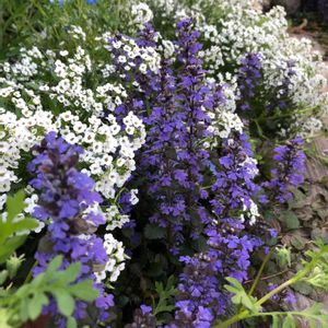 アジュガが元気です☘️☘️ スイートアリッサムとのコラボ✨✨ なかなかいい感じ💕 アジュガは雑草対策のためにあちこちにうえてます😁