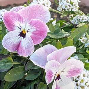 ビオラ おかめももか 淡いピンク色が可愛らしいです♪ スイートアリッサムと 相性がいいですね☺️