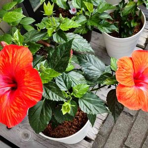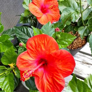 ハイビスカス🌈(レッド) 去年、職場に頂いた鉢↖️ お花が終わり私が頂き一回り大きな鉢➡️に植え替え、今朝、蕾を発見🥰 剪定をしなきゃいけなかったかなぁ〜 今年はこのままで、とりあえずお花を咲かせてもらって次に形を整えよう❗️