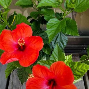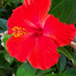 こんにちは👋😃 ハイビスカス、レッド 赤い中ぶり花径10cm 咲いています。 今年4つ目の花。 光り当たって綺麗。