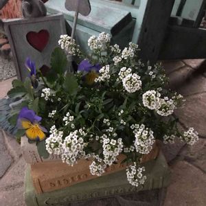 今日のお花アリッサム💮 ビオラ何色にしようかな?と迷い小さな寄植えを買いました😊アリッサムがとても引き立ってます!