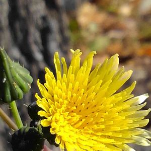 ノゲシ(野芥子) 別名、ハルノノゲシ(春の野芥子) 名前に「ケシ」がついていますが、ケシの仲間ではないそうです(^.^) 花期は、主に3月~10月ということですが、一年中、見かけているような気がします(^_^) レモンイエローの花が綺麗でした(^-^) 堤防のコンクリートの隙間に沿って、数株、生 えていました。 葉の縁にふぞろいの鋸歯があり、トゲ状に尖っていますが、見かけ倒しで、触っても痛くありませんでした(^o^)