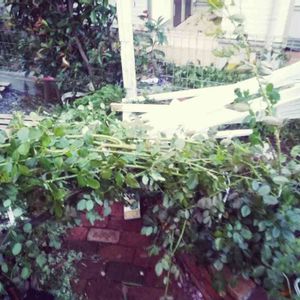 気温的にはまだかなり早いですが、時間のあるうちに進めたいので、ラレーヌビクトリアのポールから冬作業はじめています。台風で倒れてしまったので、モルタル使って補強中。枝先の細い枝や古い枝も剪定しました。