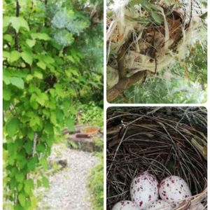 玄関脇のアケビの蔓が絡まっているミモザの木に、ヒヨドリが巣を作って、卵を産んでいました。😆💞🍀 パッと見には、見えない蔓の間に、白いビニールひものゴミが絡まっていると、取ろうと近づいたら、 なんと、その固まりは、鳥の巣で、 梯子に登って上から見たら、卵が、4つ、ありました。 親や、子供、友達に、ラインで、この画像を送ったら、 友達の夫が、調べてくれて、 ヒナドリと判明しました。 私達が、玄関を出入りする度に、ヒヨドリが、巣から飛びたって、卵を温められなくなるから、 しばらくは、勝手口から出入りするようにしています。😂