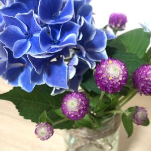 実家からもらったお花╰(*´︶`*)╯♡ この紫陽花は今年この二輪?しか咲かなく貴重なのに、私に持たせてくれました✨他のがまだ咲くからって😌 喜んでもらうのが好きなサービス精神旺盛な母(*^^*) おまけに千日紅も♫ 久々にお花を飾りました✨暑いからお花買うの控えてたけど、もう限界でクーラー入れっぱにするから大丈夫かな😌