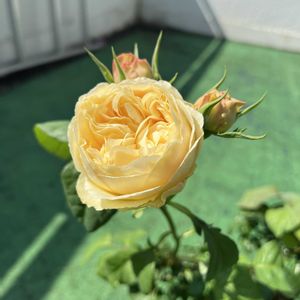 おはようございます。 気持ちの良い日です。春バラも終盤 和バラ風月 昨年はピンク色も乗っていましたが 今年は柔らかい黄色のみで 沢山の花びらが巻いています。