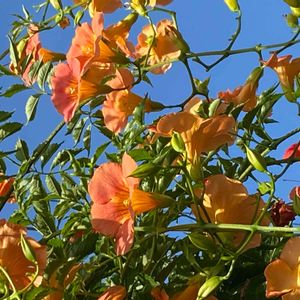 ご近所の病院の駐車場に咲いているノウゼンカヅラ、オレンジ色で美しく咲いていました😍🌿