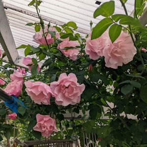 パーゴラの上のバラばら🌹 スパニッシュビューティ がチラホラ咲き始めました。 今日は青空のもと 先進んだかな〜😀