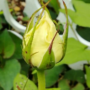 MyGarden 🌹バラ ジュビレドゥモナコ ジャガイモの中に埋もれていたので日照不足になったのか、茎が細く頭が重くうなだれてしまう (。>﹏<。)ごめんなさい…