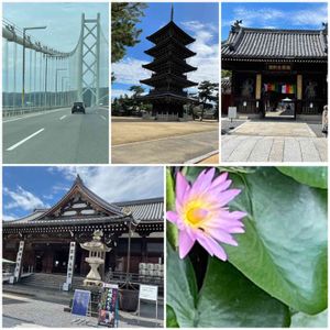 明石大橋から淡路島 鳴門大橋🍥 四国志度 墓参り後高松 金毘羅泊 善通寺弘法大師誕生日の地 四国第七十五番霊場 お参りして来ました 人もいなくゆっくりお参りして来ました😊 ハスの花が橋の下で咲いてました🌸