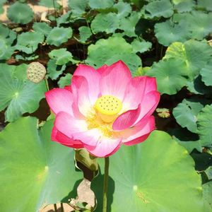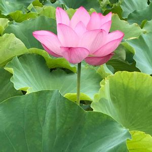 鶴丸城跡のお堀のハス 驚くほど巨大化してて驚いた(笑)‼️ 目線の上にハスの葉の傘(上の写真) 昨年はお堀を見下ろして花を見ていたのに 今年のハスは 175センチの夫の頭上に咲く花も! 3メートル以上あるのでは? 右中央のハスの種は直径20センチ以上ありそう! 市立美術館でドービニー展を観て、 その後は城山散歩をしたいところでしたが、台風の風と時々強く降り出す雨に断念!鶴丸城跡のお堀のハスを見て帰りました。 今年は水生植物園で可愛いチャワンバスばかり見ていたので、巨大化したハスに驚かされました♡♪