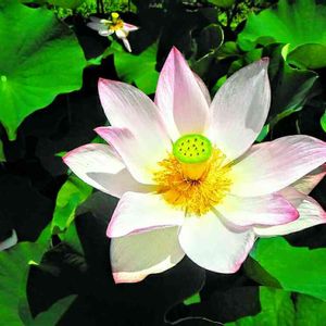 アメリカ黄蓮 素敵な一日になりますよう 今日も笑顔で💗(=^ェ^=)♫ <追記> 分類学的にはハスとは別種のキバナハスになりますが、見た目はハスそのものです。東洋のハスと交配する事ができ黄紅、クリーム色などの交配品種が生まれています。 ミシシッピ川流域から南米北部に自生。 写真後方の白いのは、ハスです。 東大ハス見本園にて撮影。
