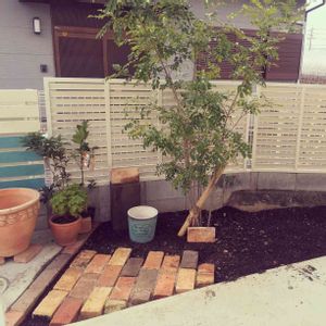 まだ未完成なんですが、今日やっと土が入った感じです💦 大きな石を5個ぐらい取り出した分、土で埋めないといけなくて何リットル入れたかわからんぐらいいれた😅 とりあえずアンティークレンガの並べてこんな感じになった😊やっぱり目地入れることにした👍🏻 でも下の地盤が固いのでセメントで固定はせずに真砂土の地固まる待ち🤔雨降って地固まる! ポイントとして枕木1本たててみた季節の寄せ植え鉢とか、見せたい雑貨など置いたらいいかなぁ〜と(指) ほんとは外壁も塗りたい…😥 あと…めずらしく旦那さんが育ててみたいと言ったりんご、植えようかと思ったら果実用の土じゃなくて果実用の肥料を買ってしまってたみたいで開けてみてびっくり😨🙌🏻 しかも20ℓも買ってしまった…使い切れないほどの量💦どうしよう😥 んでまた土買いに行かなあかん… んで、レモン、キンモクセイ植え替え待ち〜😉💦 あ〜、時間が欲しい。。。