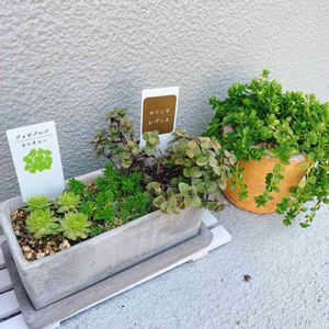 カリシアは白のスクエア型に植えました。 伸びてボサボサになってきた💦 隣のエケベリアは年末に葉挿しからここまで来たんだけど、お店で売ってる大きさになるには相当な時間必要なんだなあ。