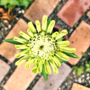 グリーンの百日草。種から育てたけど大失敗でこの子だけしか生きのこらなかったー😭頑張って咲かせるぞ💪あと少し💨