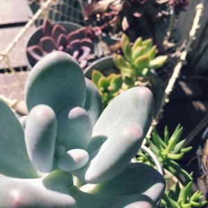 『月美人』 7月9日……。 ……珍しく夫が一緒に見ていて、どうもこういうぷっくらした子が好きみたいで(私の葉っぱの好みは彼から見たら地味らしい💦)、この前の迎えた子と同じと知っているのに、「買え買え」攻撃(笑) 舞い上がってあれもこれもの後に、少し理性的になって、カゴから戻すと「うちに来れると喜んだのにかわいそうだ❗️」と始まるし、「(葉っぱ破産しても)知らないからねー❗️」と言うと、「なんの脅しなんだ、そんな脅しが俺に効くはずないだろう」と、いつもの会話。 止めて欲しくないけど、止めて欲しいような複雑な乙女心の中、連れ帰る……。 (止めない人だと知っているから、結局私があざといのか……💦) 多肉ちゃんたちに朝から太陽ぎらぎら……。