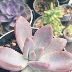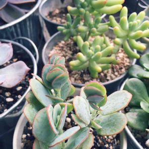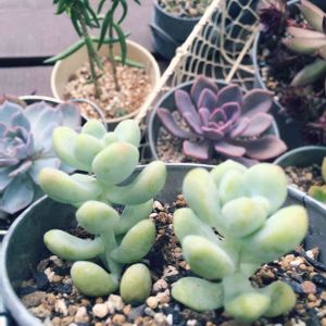 小さい子たち💗 一番手前の赤ちゃんグループは、『不死鳥』と親が病気になってしまった『カランコエ・胡蝶の舞❓』の赤ちゃん。 ドレッシングの蓋に穴を開けて(笑)、今日から外へ。 手前から二番目の双子ちゃん❓、名前不明、7月9日仲間入り。 『白牡丹』なのかなあ❓ 奥の子も名前不明。 ホームセンターの100円の小さな鉢で、好みの子だから悩んでいたところ、落としてしまい、連れ帰る。 日付けは分からなくなっちゃった💦 我が家に来たら、形だけではなくなんだか葉っぱも汚れ❓てしまって、ごめんね😣 この子も形は『白牡丹』にそっくり❗️