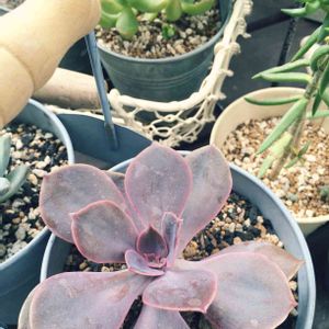 『パールフォンニュルンベルク』 我が家では古株❓(5月にきた)の『パープルパール』との違いもよく分からないまま、理性がどこかへ行ってしまい、7月9日仲間入り。 環境に慣らし中、さっそく開いて下葉が取れ、変な形に……。 この色、大好き💗