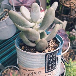 『マルニエリアナ』 7月9日、丸い葉と淡いグリーンにひとめ惚れ💗 カランコエの仲間みたい、分からなかった💦 カランコエ……5月に連れてきた子がすぐ病気になってしまい、寒いのも弱いみたいだし、🌟にしたこともあって、私には不向きかなあと苦手意識あるけど、どうなるかな❓ 日に当てて、お水も様子を見ながらちょくちょくあげている。 我が家にきたら、葉っぱが閉じた。