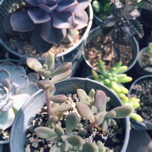 『カラスミセバヤ』 葉が根元のあたりでくるくるして広がってない姿が可愛くて6月19日、連れ帰る。 姿が変わってしまった……😅 『白雪ミセバヤ』同様、お日様もお水も全く注意せず、状態が良くない❓ 手こずっている。