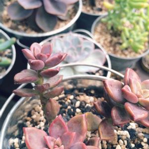 『センペルビウム・ルブリン』 5月26日、連れ帰る。 ……去年庭、地面にいたはずなんですが💦 同じ赤系の子。 直射日光ガンガンで、お水はこの間久しぶりにあげたけど……元気なのかそうでないのか、全く分からず、取れてしまった赤ちゃんふたりも🌟😢 皆さんのグリーン系がとても素敵で、なのに私がホームセンターで会う子はそんなに綺麗な色合いではなくて……😅 グリーンも可愛いよね💗