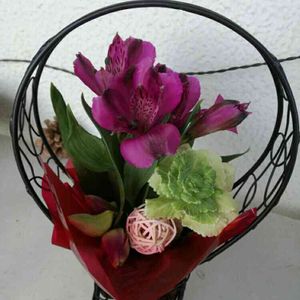 来週行う花育講習会の見本を作ってみた。 ミニミニアレンジメント(*^^*) 小鳥の手作りワイヤーピックをプラスして♪ ストックの香りが辺り一面に広がって、春気分♡