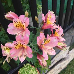 お隣のフェンスの隙間から顔を覗かせるアルストロメリア♡ 色合いがとても綺麗です😊 ちょうど我が家のエントラスにあたる位置に咲いてくれるので来客をお出迎えしてくれます😊