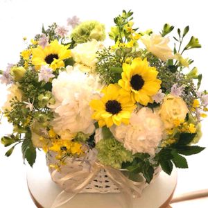 お見舞いのアレンジメントです。 ご回復を願うお気持ちに添えるよう、 隅田の花火という紫陽花、芍薬、向日葵など季節のお花をたっぷりと挿しました。 ご注文ありがとうございました🙇♀️