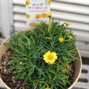腰痛と引き換えに玄関に引き込んだボンザマーガレットさん。かわいく咲いてくれて良かった〜😢 滅多に雪が降らない地域なので天気予報に翻弄されてます😢