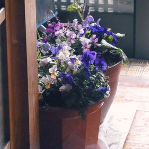 「寄せ植えのビオラたち💠」 晴れ⛅️て来ました。 冷たい風はあるのですが 鉢植えたちを少しテラスに出して 日光浴☀️タイム。