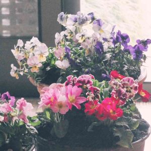 「寄せ植えのビオラたち💠」 外は寒いけれど… 朝から晴れ☀️ 「寄せ植え💠」の植木鉢たちを テラスに出したら 皆 嬉しそう😊💞