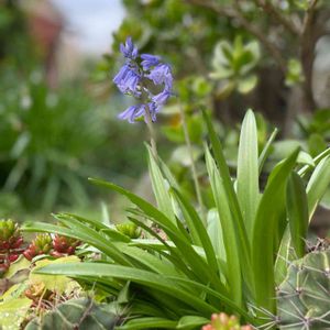 サボテンに混ざって一株、ブルーのお花😍 5年ほど前に植えたらしく、でも名前は忘れちゃったと言う母😅 ご存知の方おられましたら、教えてくださ〜い🙇♀️